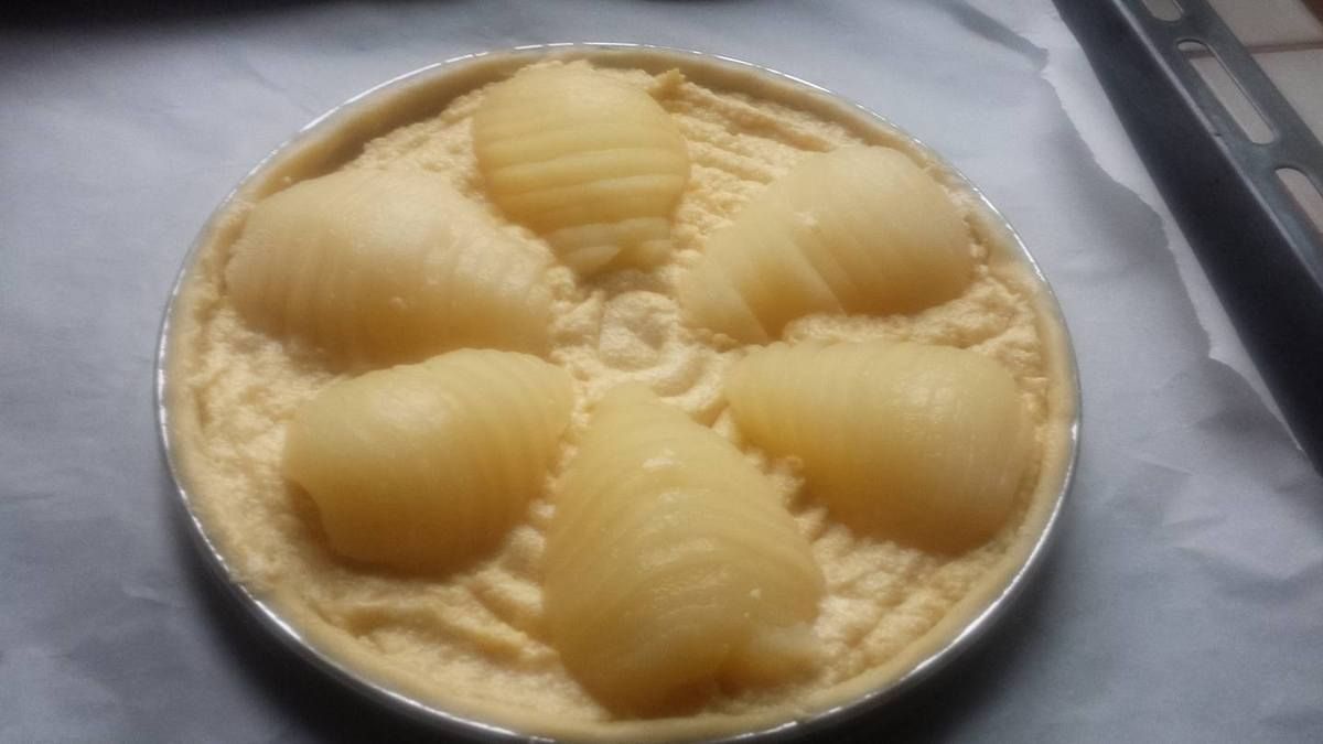Placer les demi-poires tranchées en cercle sur la crème d’amande.
