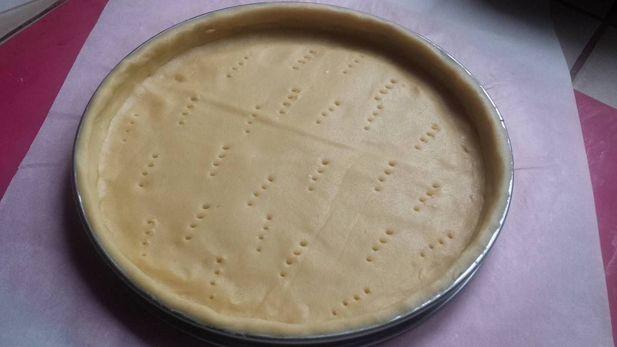 Abaisser la pâte sur environ 3mm d’épaisseur et foncer un cercle à tarte de 22cm de diamètre.
